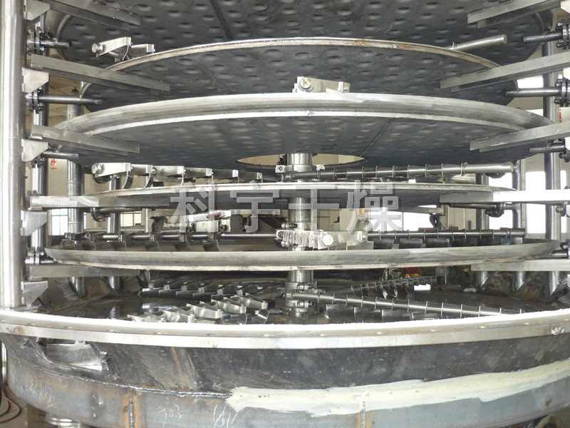 濕物料自加料器連續(xù)地加到干燥器上部第一層干燥盤上,帶有耙葉的耙臂作回轉運動使耙臂作回轉運動使耙葉連續(xù)地翻抄物料。物料沿指數(shù)螺旋線流過干燥盤表面,在小干燥盤上的物料被移送到外緣,并在外緣落到下方的大干燥盤外緣,在大干盤上物料向里移動并從中間落料口落如下一層小干燥盤中。大小干燥盤上下交替排列,物料得以連續(xù)地流過整個干燥器。中空的干燥盤內(nèi)通入加熱介質,加熱介質形式有飽和蒸汽、熱水和導熱油,加熱介質由干燥盤的一端進入,從另一端導出。已干物料從最后一層干燥盤落到殼體的底層,最后被耙葉移送到出料口排出。濕份從物料中逸出,由設在頂蓋上的排濕口排出,真空型盤式干燥器的濕氣由設在頂蓋上的真空泵口排出。從底層排出的干物料可直接包裝。通過配加翅片加熱器、溶劑回收冷凝器、袋式除塵器、干料返混機構、引風機等輔機,可提高其干燥的生產(chǎn)能力,干燥膏糊狀和熱敏性物 料,可方便地回收溶劑,并能進行熱解和反應操作。